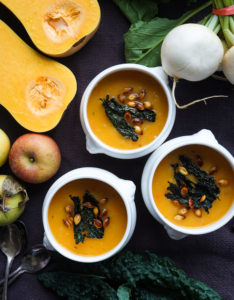 Butternut Squash Soup with Crispy Kale and Chili-Roasted Seeds