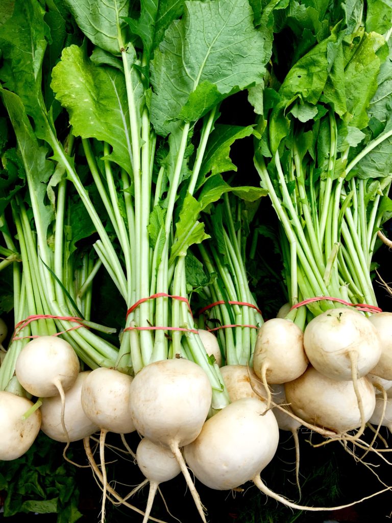 This week’s farmers market catch is absolutely spectacular in flavor and textures but can be a little scary at first glance. Turnips are sometimes passed by at the market because they are confused with the aged purple turnips found in the grocery store. These old and usually large turnips really work best in soups, stews or roasted for a while in a hot oven (but really, what doesn’t?). Fresh white Japanese turnips are so very tender and sweet with only the slightest hint of bitter, just enough to round out the flavor.