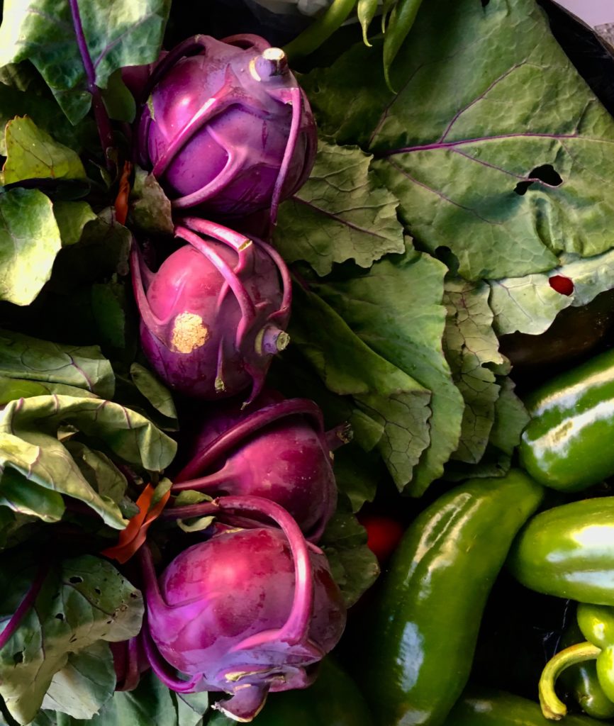 Kohlrabi also often sits alone on a market table. I watch shoppers walk by wondering what to do with this root that looks almost otherworldly, its thin cords wrapping around its body and up to its leaves. Kohlrabi is often found white, pale green or in beautiful shades of purple. There is nothing to fear. This is a very versatile vegetable and very easy to prepare. Once peeled, the white interior is very similar to turnips but with a flavor that is even a bit milder.